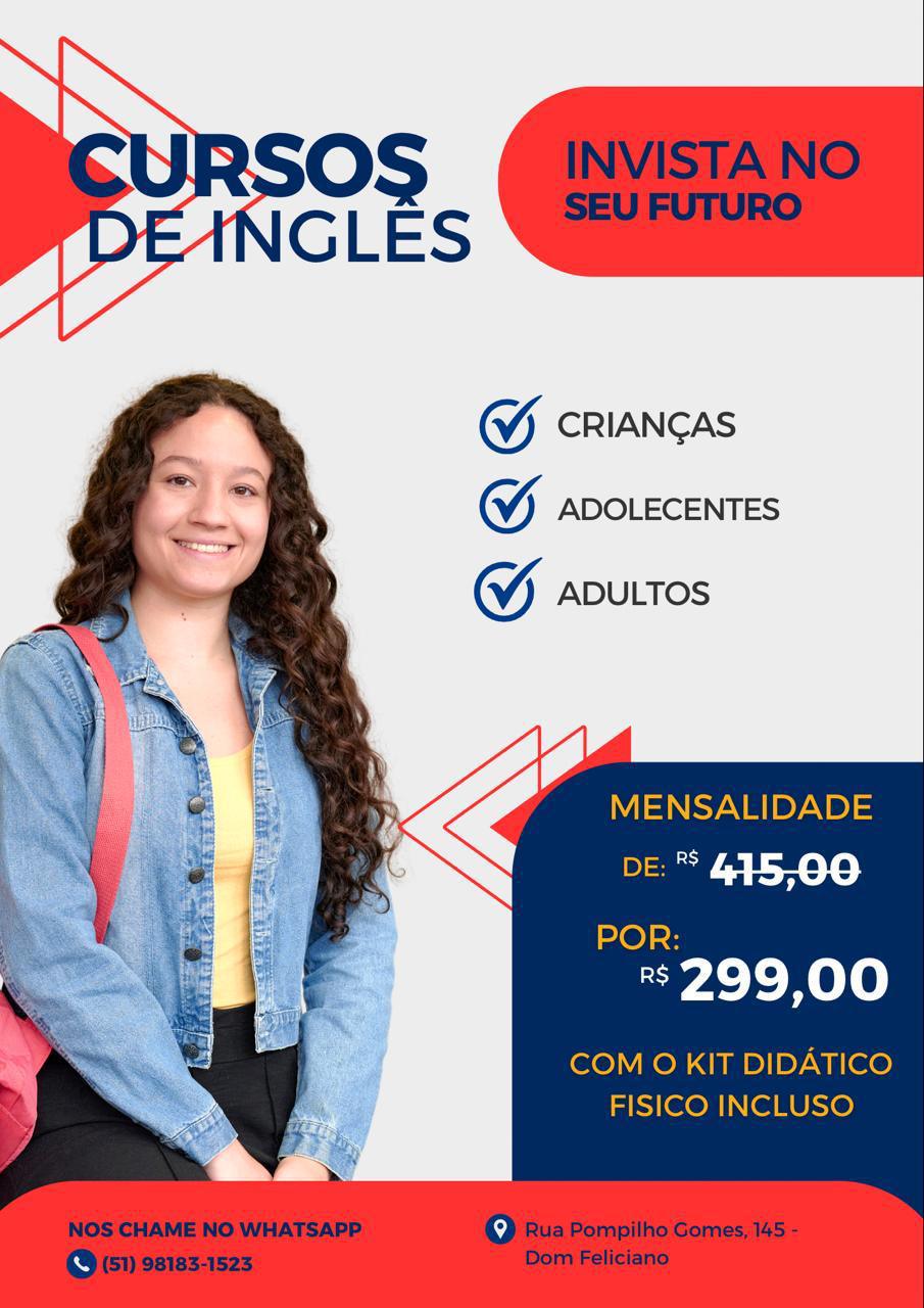 Curso de inglês para todos os níveis 145 R. Pompilho Gomes - Dom Feliciano - Gravataí RotaLigarWhatsApp Promoção: Curso de inglês para todos níveis Valor: De: R$ 415,00 Por: R$ 299,00 Fim da Promoção: 20/03/2026 Empresa: Wizard Gravataí + informações RotaLigarWhatsApp